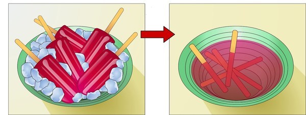 'n Blok ys, 'n baksteen, en 'n malvalekker word langs mekaar in die son gelos op 'n warm dag. Bespreek watter veranderinge jy sal waarneem in hierdie voorwerpe na drie ure.