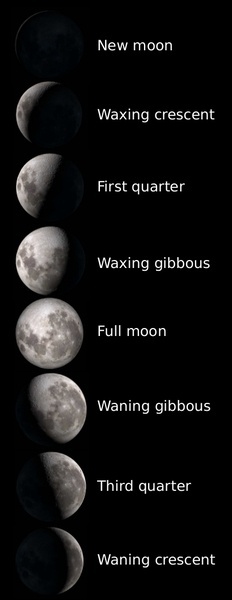 As the Moon orbits around the Earth, it appears as though the Moon is changing its shape in the sky. The Moon changes from a thin crescent to a full circle or disk (full moon) and then it shrinks back to a thin crescent again. It is then not visible for a few days again. These changes in the Moon's shape are called the Moon's phases.